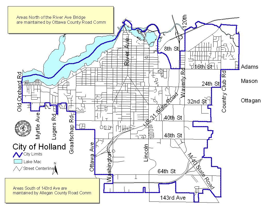 View the map (JPG) to see if your street is plowed by the City of Holland. For problems or questions regarding snow removal in the City, please call us at 616-928-2400.